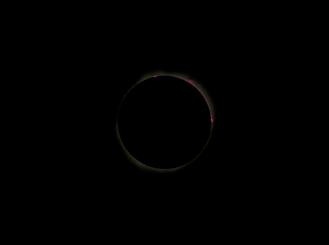 During the total eclipse of the Sun on August 21, 2017, solar prominences were visible on the limb of the Sun. A solar prominence is glowing plasma - hot electrically charged hydrogen and helium gas. The electrically charged plasma flows along magnetic fields generated by the Sun. The solar prominences seen in this photograph extend hundreds of thousands of miles from the surface of the Sun into the corona.