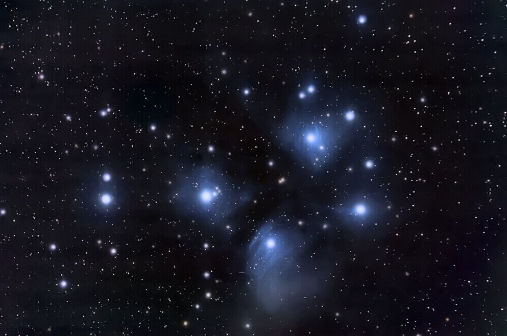 To the average person, the Pleiades Star Cluster appears as a tight knot of 6 or 7 stars. This star cluster is often called the "Seven Sisters." The nine brightest members form a pattern that resembles a dipper, and for that reason, it is sometimes mistaken by beginners as the little dipper. It is an excellent object to view with binoculars. The Pleiades star cluster is one of the closest open star clusters to us, having a distance of about 440 light years. The nine brightest members are all B-type giants concentrated in a region about 7 light years in diameter. The brightest star is Eta Tauri, also named Alcyone, and is nearly 1000 times more luminous than the Sun. This galactic star cluster has a total membership of at least 1000 statistically confirmed members. The total mass of the star cluster is about 800 solar masses. This image shows a portion of the faint nebulous haze swirling around some of the stars. The spectrum of the nebulosity is identical to the spectra of the involved stars. The nebulous gasses apparently shine by star light reflected from dust and perhaps larger solid particles. The nebulosity was recorded in photographs taken in 1885.